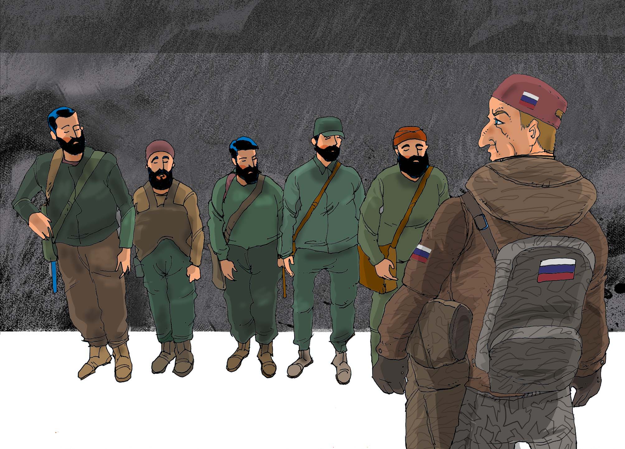أما عن الوضع هناك، فأخبرنا أحمد، شاب وقع عقداً منذ فترة قريبة مع القوات الروسية، أن الروس يشترطون أعماراً معينة، فلا يقبلون من تجاوز سن الستين، ومن تجاوز الخمسين لا يقبل به كمقاتل في الصفوف الأمامية، وتنحصر مهمة الحراس بالأعمار بين ٣٥ لـ ٥٠ عاماً وأحياناً حتى الستين.