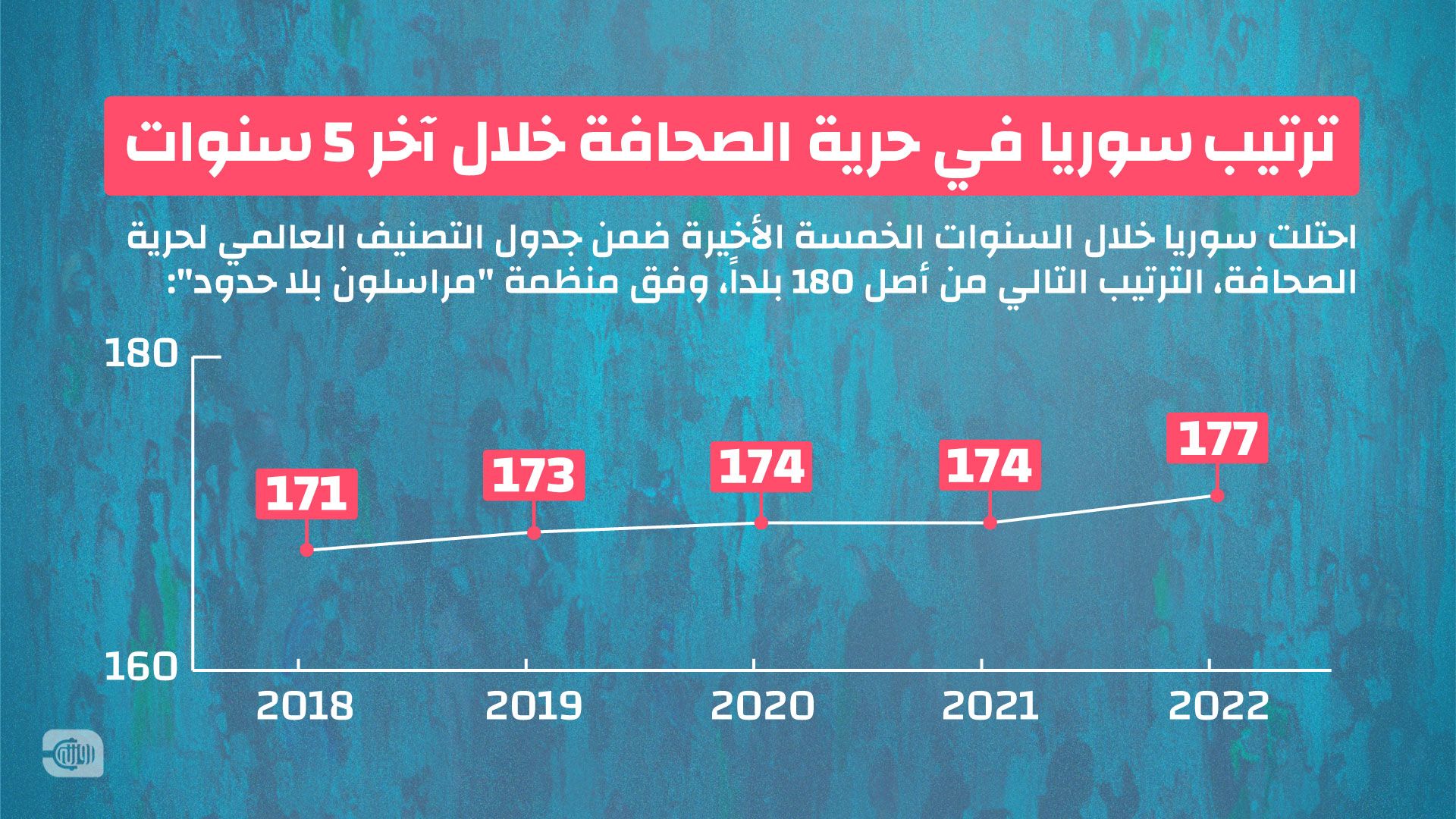 وحسب التقرير الصحفي الذي أصدرته منظمة مراسلون بلا حدود، فلقد تراجعت سوريا على مؤشر الصحافة من المرتبة 171 إلى175، تليها تركمنستان و إيران وفيتنام و الصين وتاتي أخيراً كوريا الشمالية.